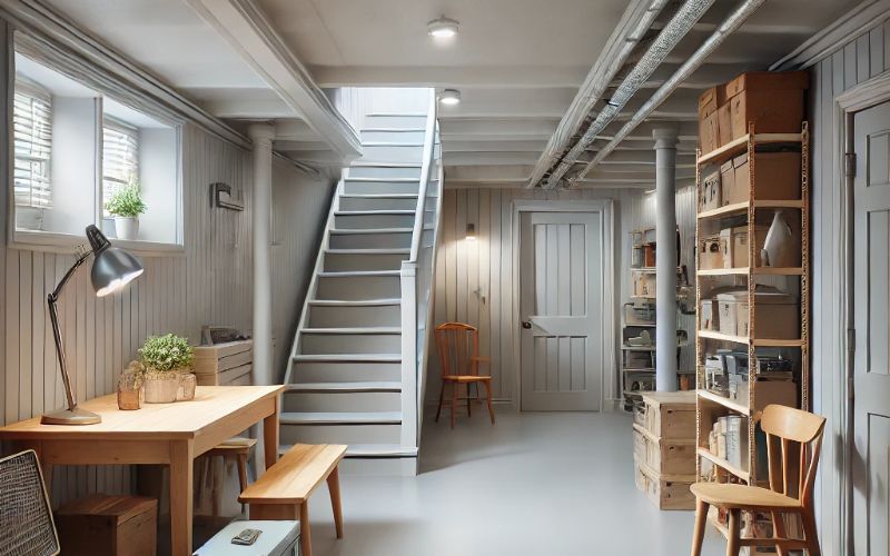 Nyrenoverad källare efter fuktskada. Spånga, Solhem